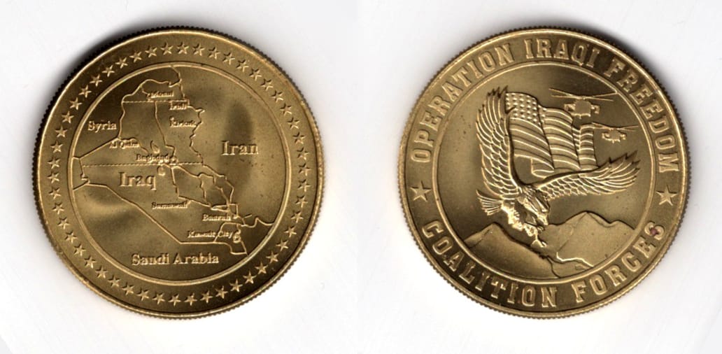 Round shaped coin, brass in color, 1 1/2 inches in diameter.