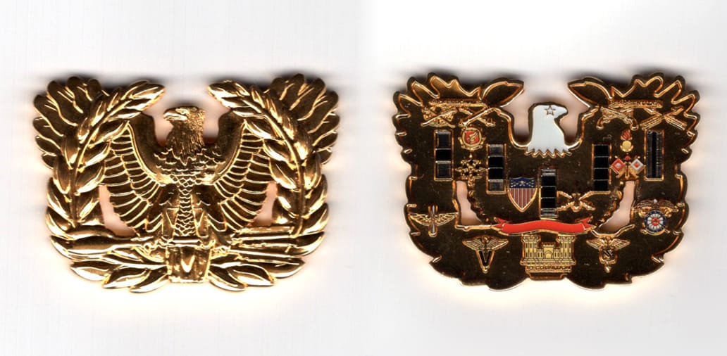 Warrant Officer Insignia shaped, gold colored coin, 1 1/4 inches high x 2 inches wide.