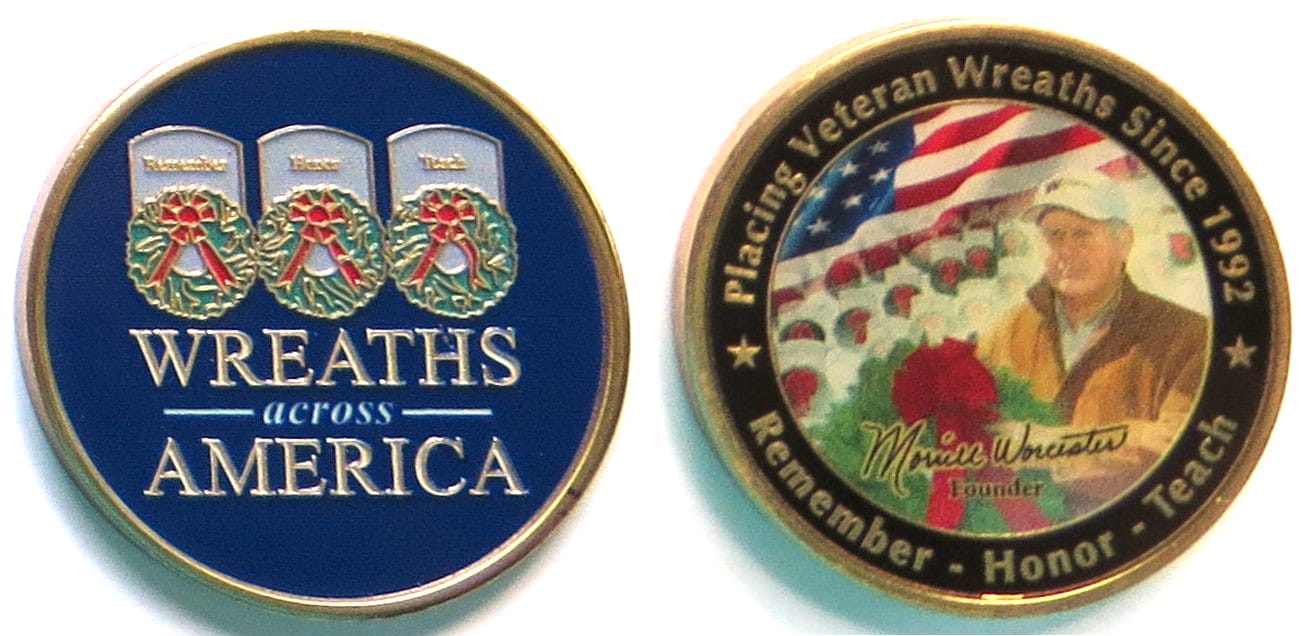 Round shaped coin, brass in color, 1 1/2 inches in diameter.