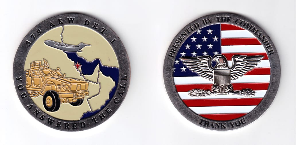 Round shaped coin, silver in color, 3 inches in diameter. Detachment 1, 379th Air Expeditionary Wing. SIDE 1: 379 AEW DET 1, YOU ANSWERED THE CALL SIDE 2: PRESENTED BY THE COMMANDER, THANK YOU The coin donor was assigned to a unit of the... Read More