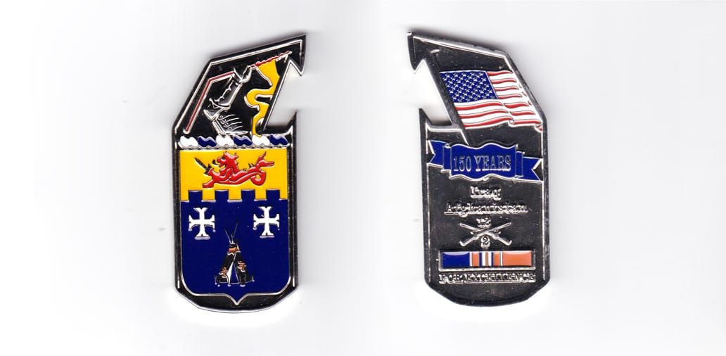Dog tag shaped coin with straight cuts on the top third making it into a bottle opener, silver in color, 3 inches high x 1 3/8 inches wide (Note. The shape of the coin mimics the coat of arms of the 12th Infantry Regiment.). 2nd Battalion, 12th In... Read More