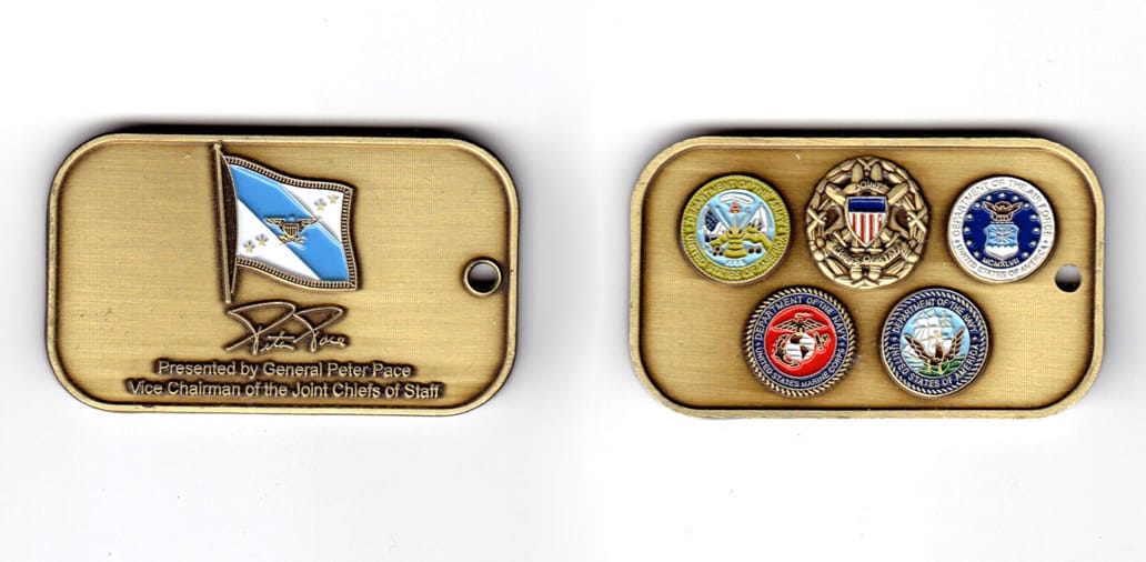 Dog tag shaped coin, antique brass in color, 1 13/64 inches high x 2 1/32 inches wide The inscription on the coin reads, "Presented by General Peter Pace, Vice Chairman of the Joint Chiefs of Staff." Read More