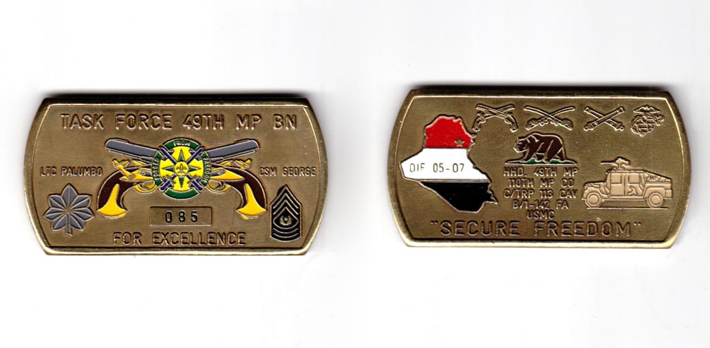 Dog tag shaped coin, antique brass in color, 1 11/64 inches high x 2 3/16 inches wide. SIDE 1 - SIDE 2 - Special Police Commandos Transition Team Read More
