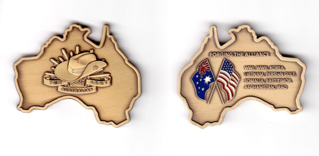 Coin is shaped like an outline of Iraq, antique brass in color, 1 47/64 inches high x 1 63/64 inches wide. The coin depicts the partnership of the Australian Army with US Troops in Iraq. Read More