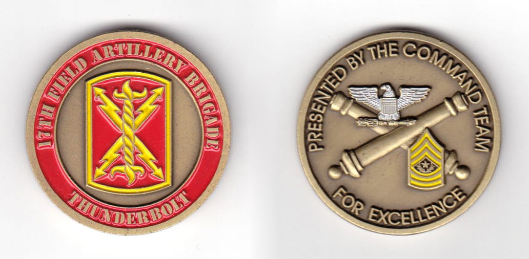 Round shaped coin, antique brass in color, 1 39/64 inches in diameter. On 17 July 2007, the 17th Field Atrillery Brigade was redesignated the 17th Fires Brigade. Read More