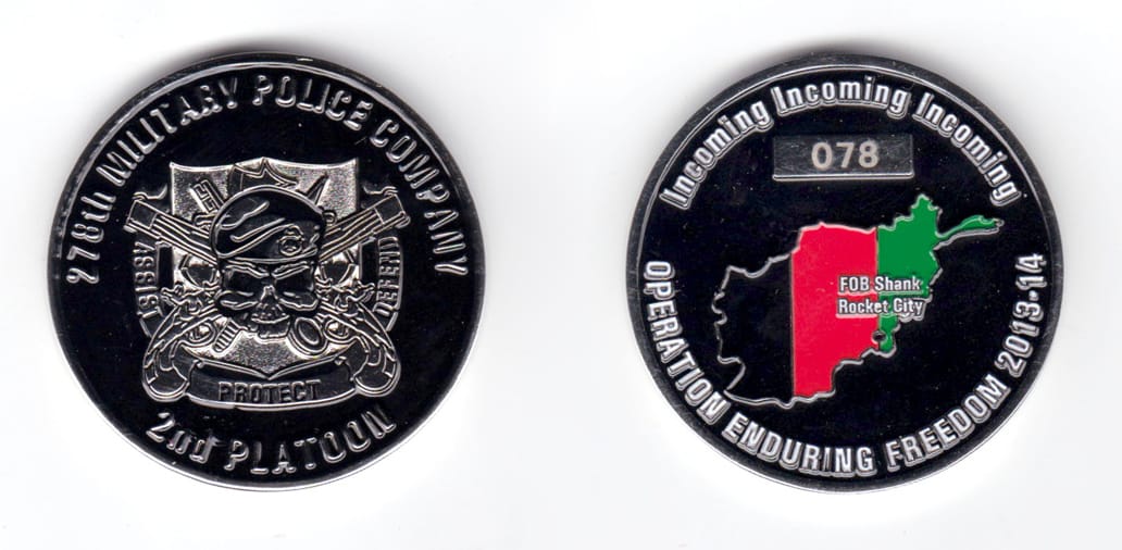 Shield shaped coin with crossed sabers behind, brass in color, 1 3/4 inches high x 2 1/2 inches wide. SIDE 1 - SIDE 2 - Coin # 38 Journal - Page 100 - Line 25 Read More