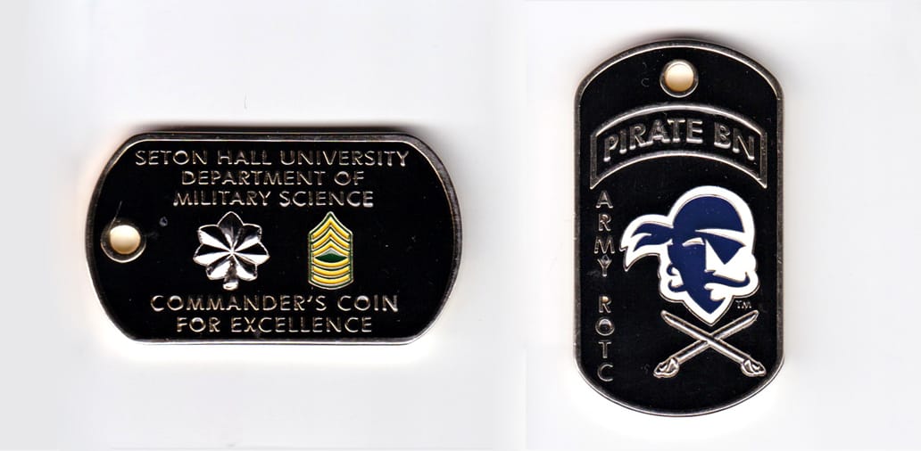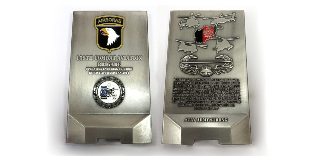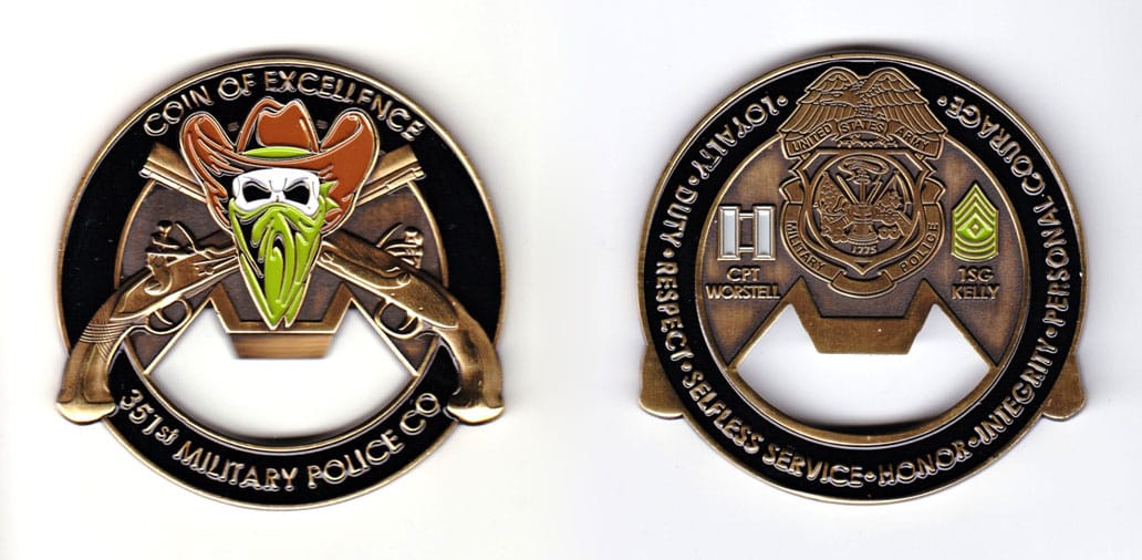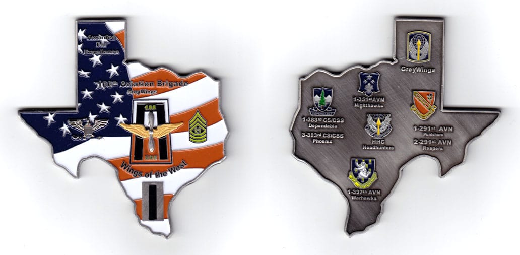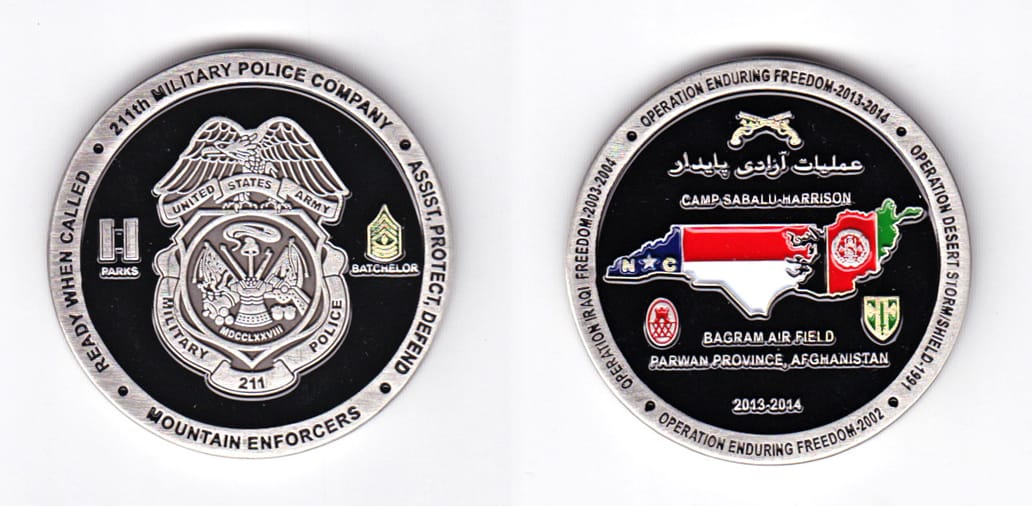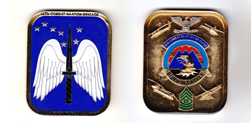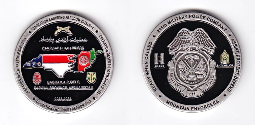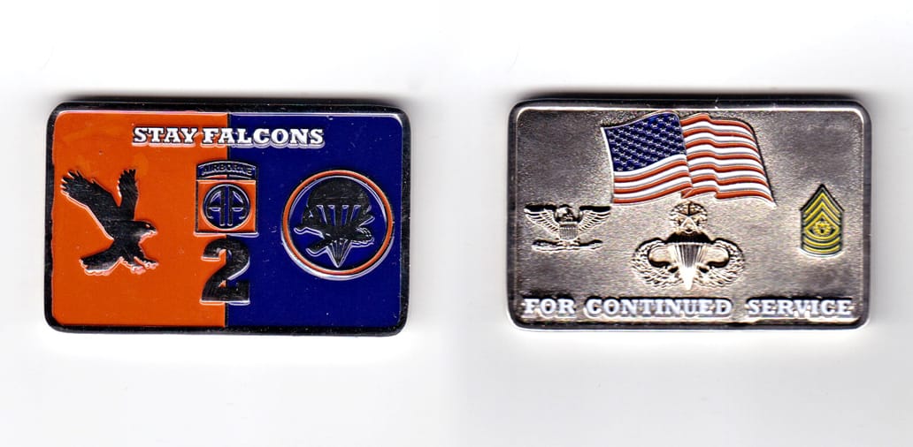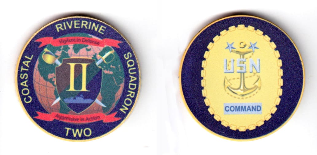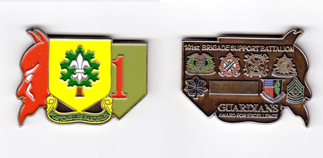 Pentagon shaped coin one point up, antique brass in color, 2 inches high X 2 inches wide. SIDE 1 - Centered on the coin, a representation of the unit's shoulder patch insignia, the description which translates to - On a green nonagon, one point up... Read More