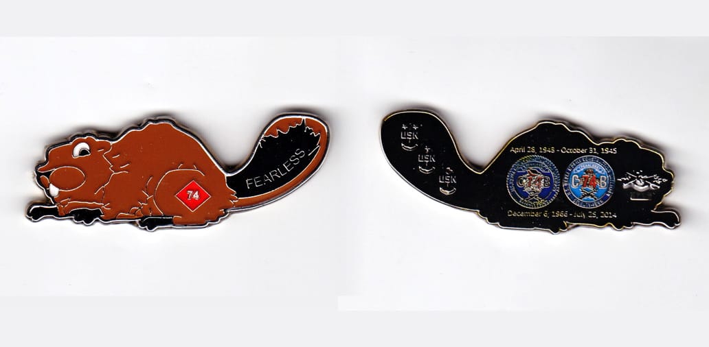 Beaver shaped coin, pewter in color, 3/4 inch high X 2 1/4 inches wide. Journal - Page 106 - Line 20 NMCB-74 has been selected "Best of Type" among the Atlantic Fleet battalions nine times during its history. It was awarded this honor under CDR G... Read More