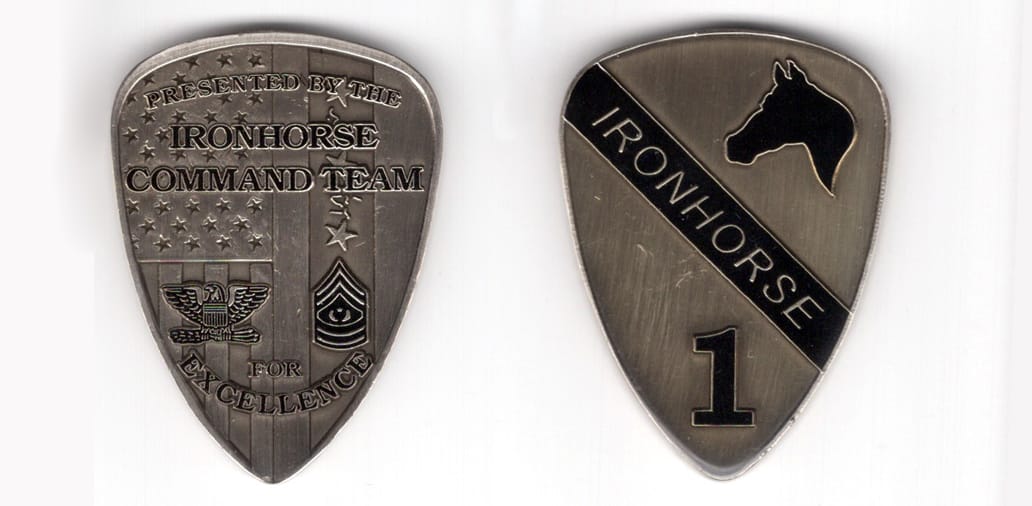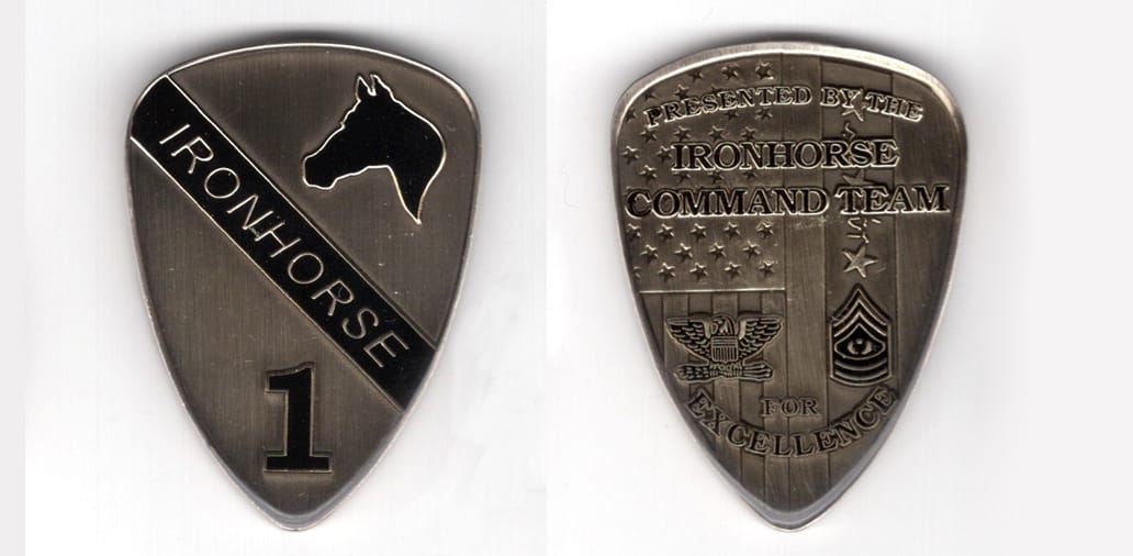 Shield shaped coin, pewter in color, 2 inches high x 1 1/2 inches wide. SIDE 1: SIDE 2: On a triangular Norman shield with rounded corners, a black diagonal stripe extending over the shield from upper left to lower right inscribed, "IRONHORSE;"... Read More