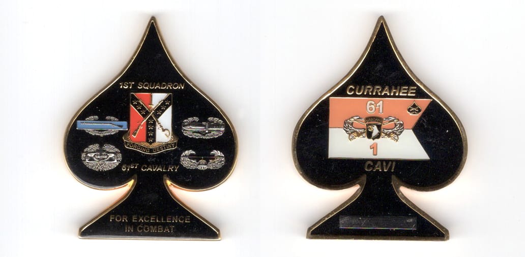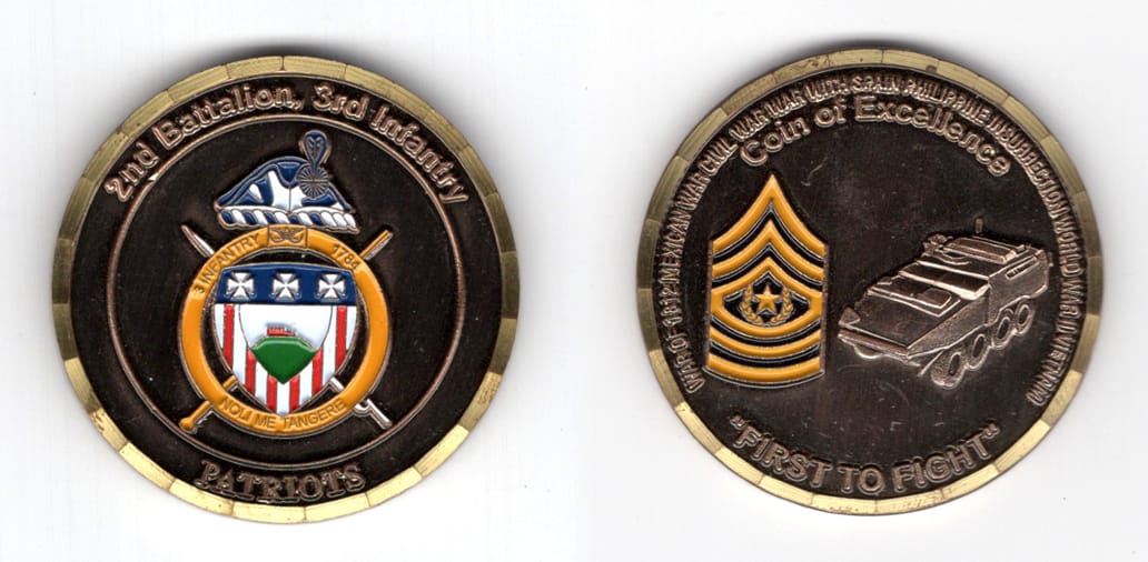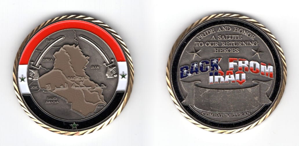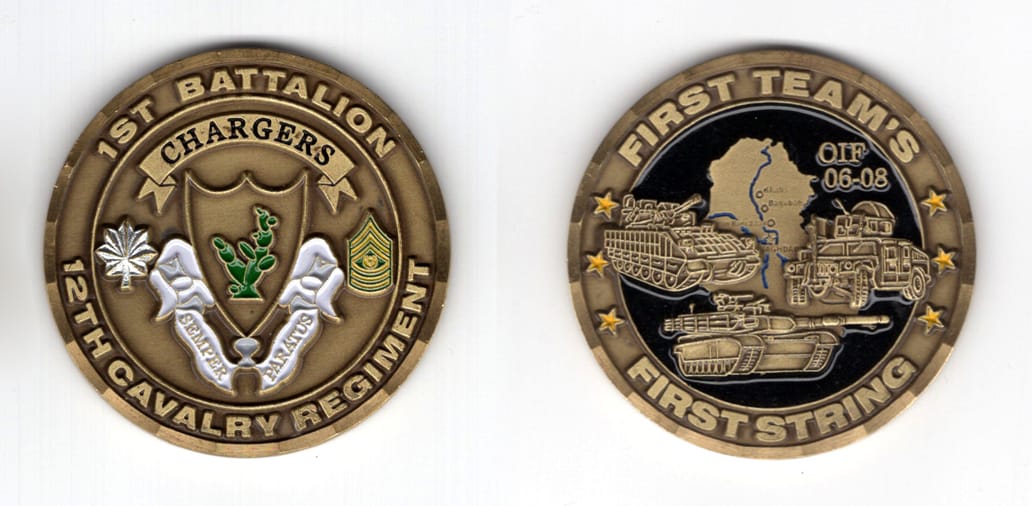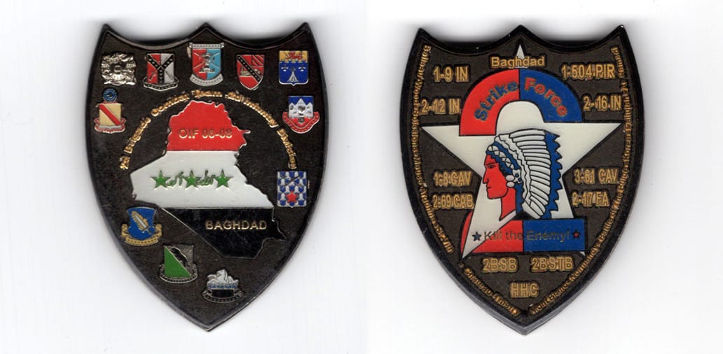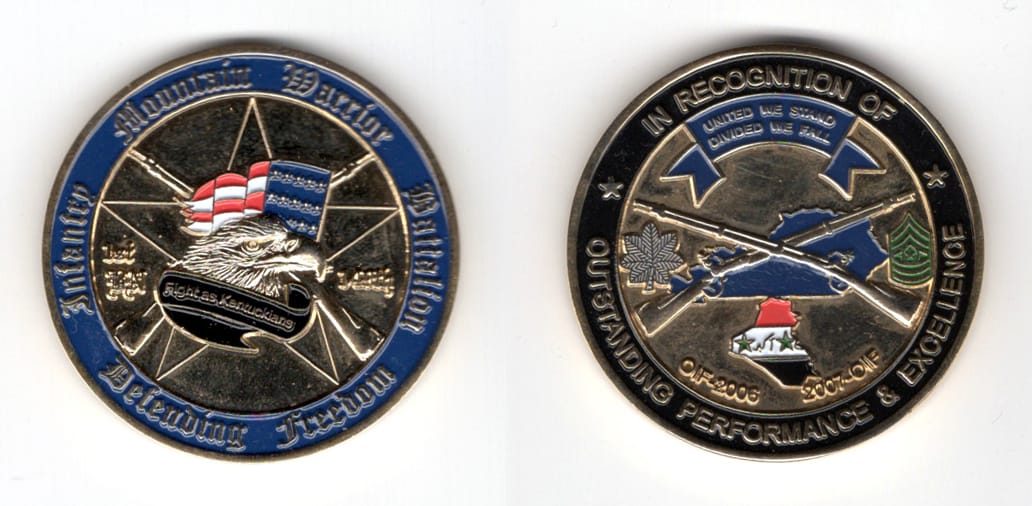 Round shaped coin, brass in color, 2 inches in diameter. SIDE 1 - B CO 2/127 IN "BLACK SHEEP" SIDE 2 - CONVOY SECURITY, WISCONSIN ARMY NATIONAL GUARD Read More