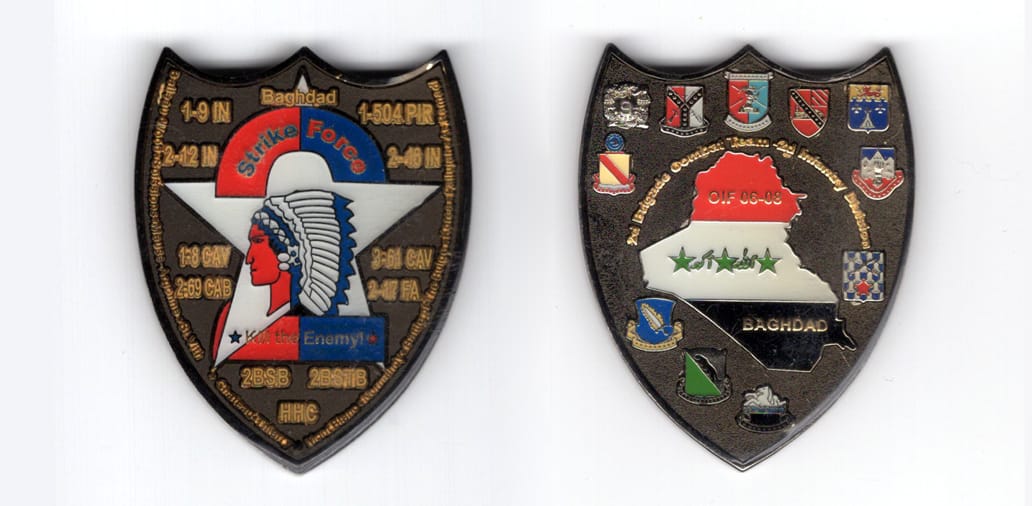 Shield shaped coin, gunmetal black in color, 2 inches high x 1 1/2 inches wide. The 2nd Stryker Brigade Combat Team, 2nd Infantry Division was first organized in October 1920 at Camp Travis, Texas. It was disbanded on 16 October 1939. The Brigade wa... Read More