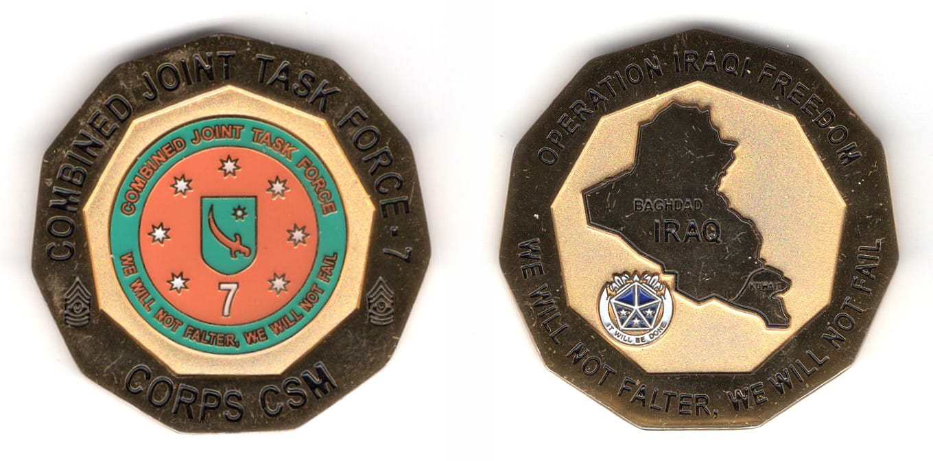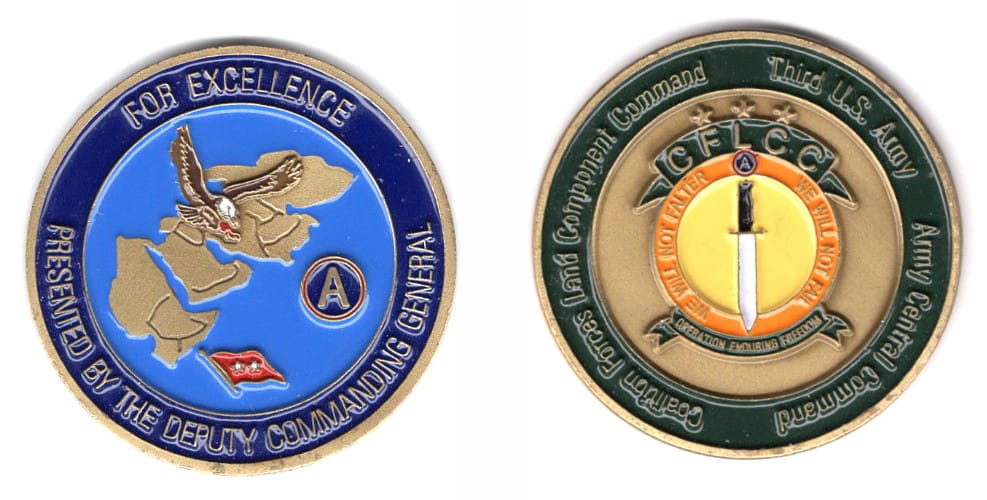 Round shaped coin, brass in color, 2 inches in diameter. Deputy Commanding General, U.S. Army Central Command. Read More