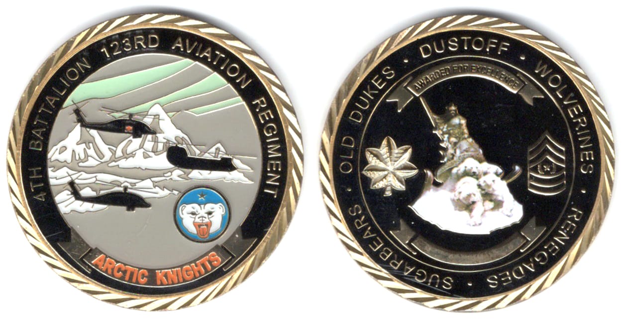 Round shaped coin, brass in color, 2 inches in diameter. 4th Battalion, 123rd Aviation Regiment was inactivated in February 2006. Read More