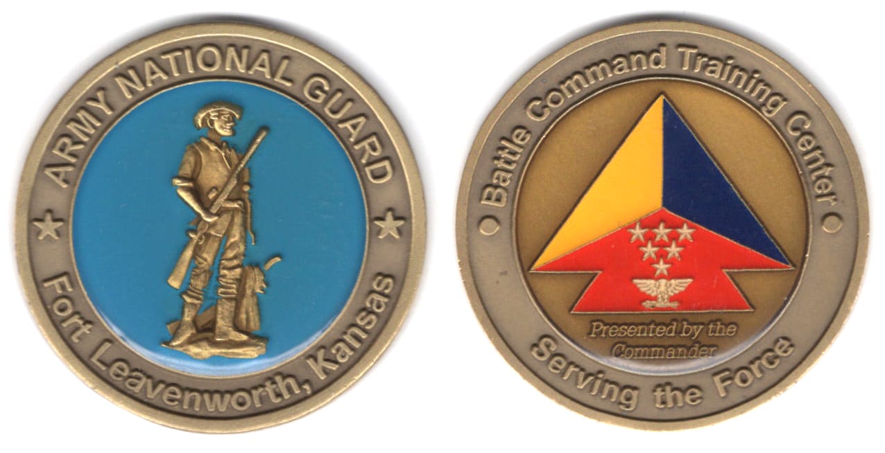Round shaped coin, brass in color, 1 3/4 inches in diameter. The National Guard (NG), in close cooperation with the Combined Arms Center (CAC), Kansas National Guard (KSNG), and the 35th Infantry Division (Mechanized), founded the Battle Command Tra... Read More