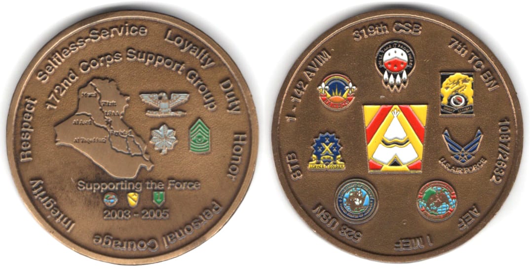 Round shaped coin, brass in color, 2 inches in diameter. The 172nd Corps Support Group was deactivated in September 2006 Read More