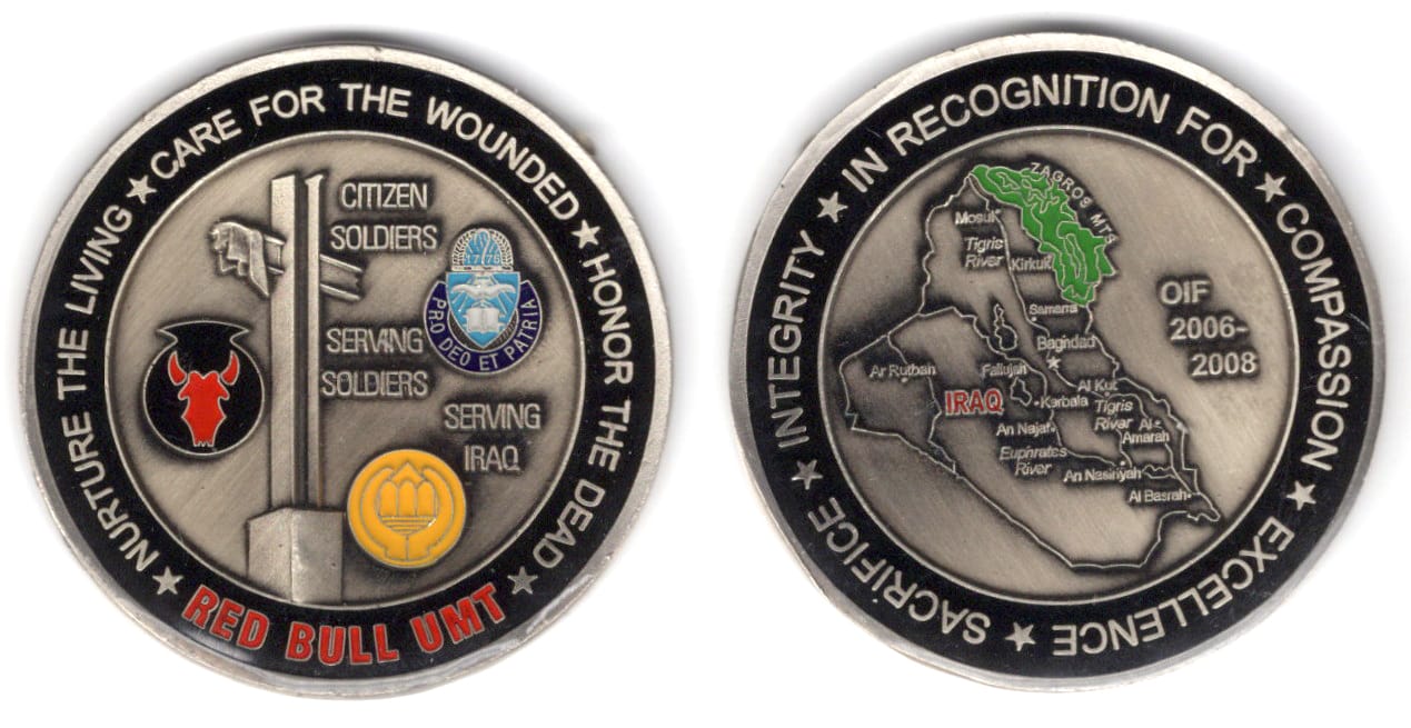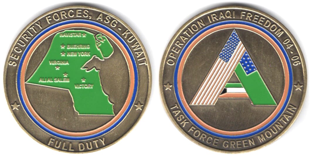 Round shaped coin, antique brass in color, 2 inches in diameter. News Article from Vermont Public Radio: 03/13/06 12:00AM By Nina Keck Task Force Green Mountain soldiers honored: "Vermont's Army National Guard paid public tribute this weekend to th... Read More