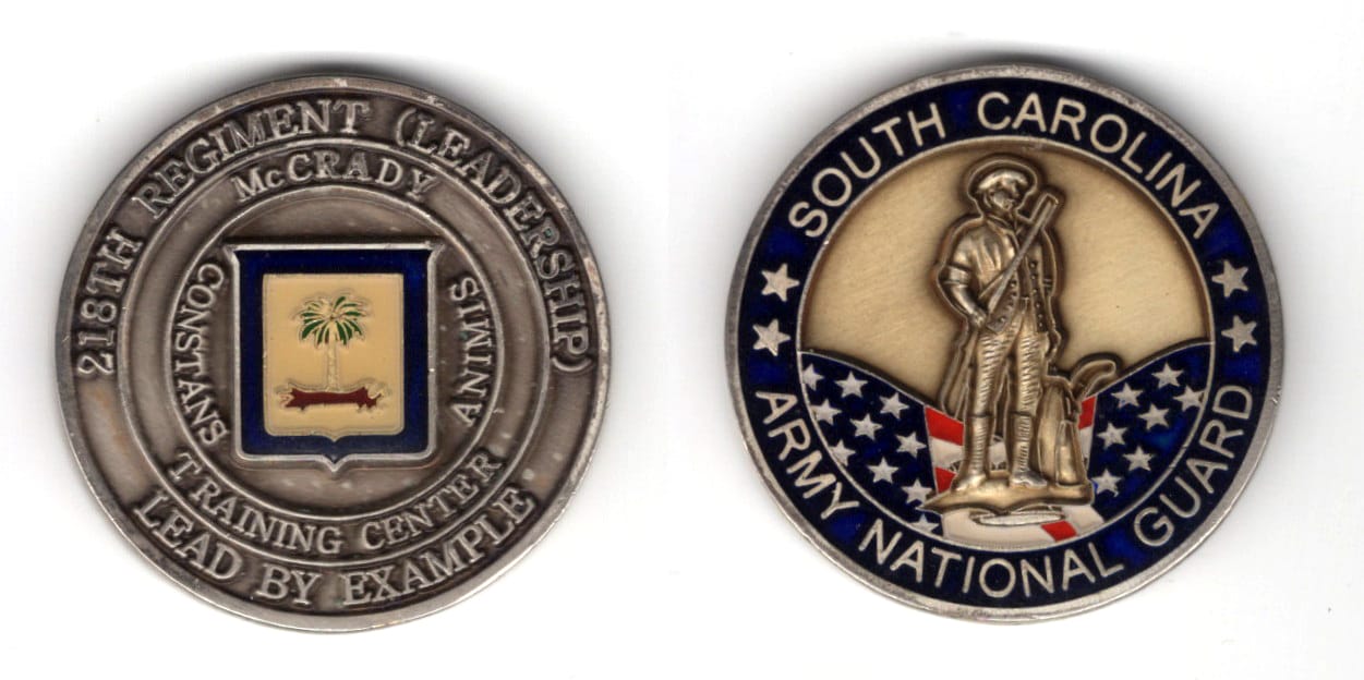 Round shaped coin, antique pewter in color, 1 3/4 inches in diameter. 218th Regiment (Leadership), McCrady Training Center Read More