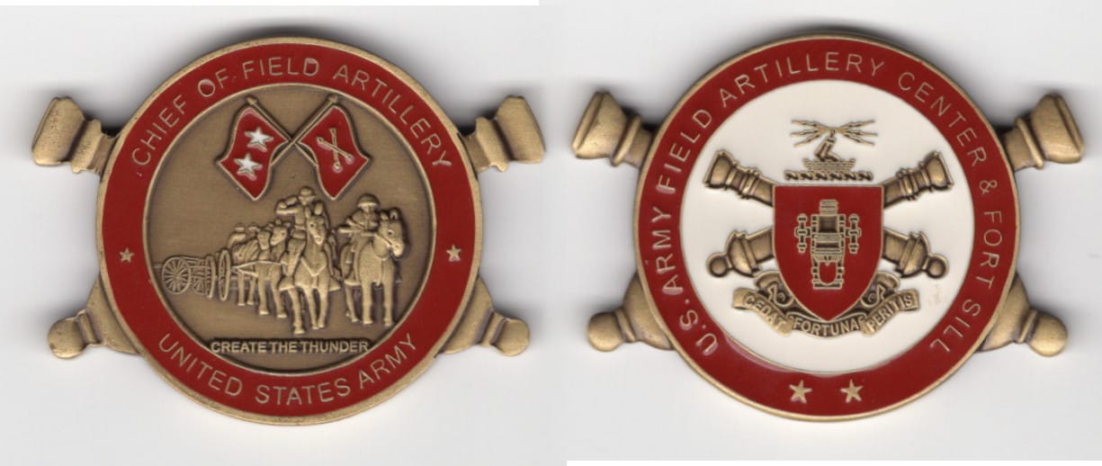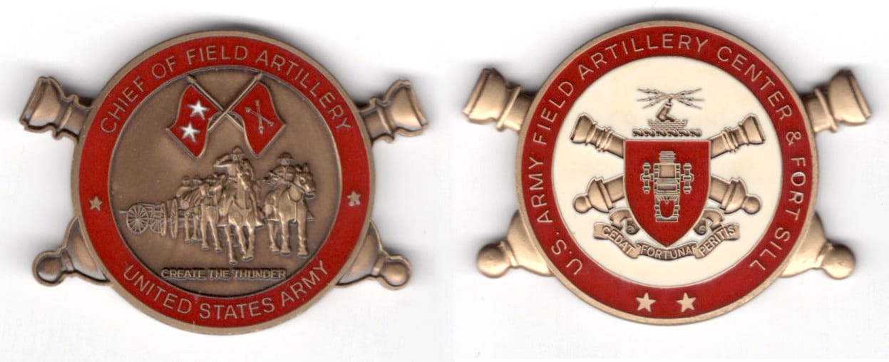 Round coin backed by crossed artillery pieces, anitque brass in color, 1 1/2 inches high x 1 7/8 inches wide. Read More