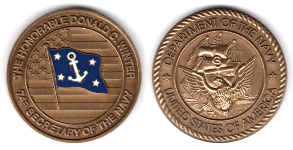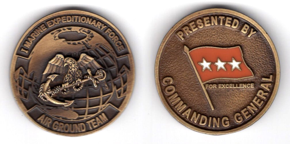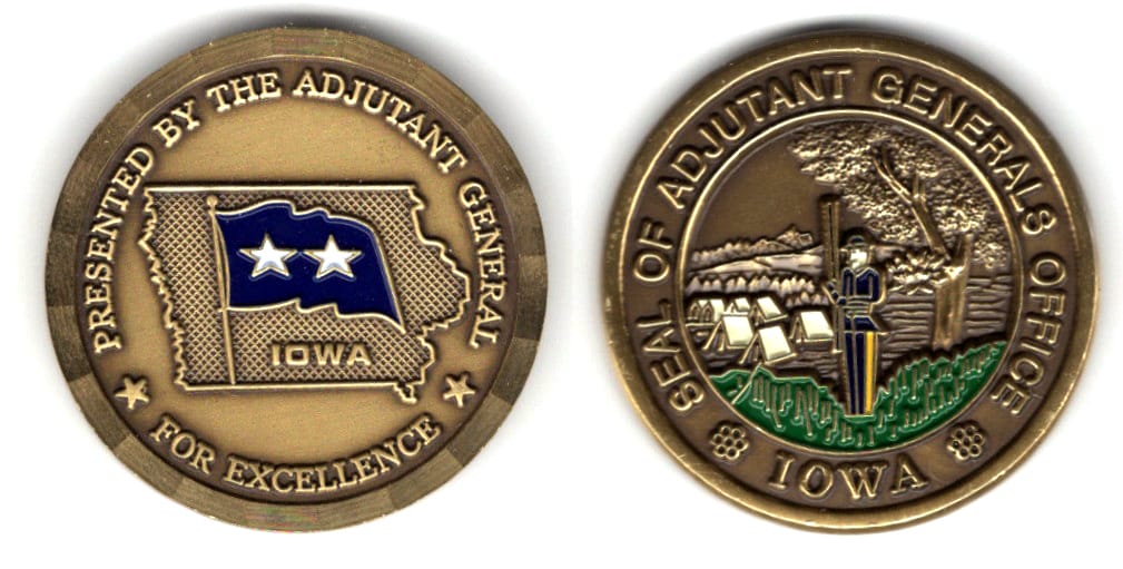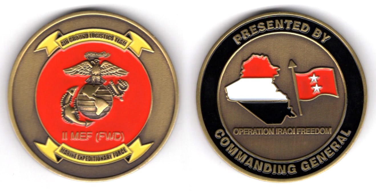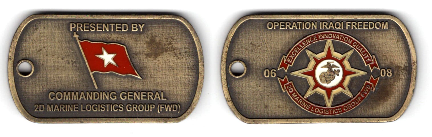 Dogtag shaped coin, antique brass in color, 1 1/2 inches high x 2 1/4 inches wide. Read More