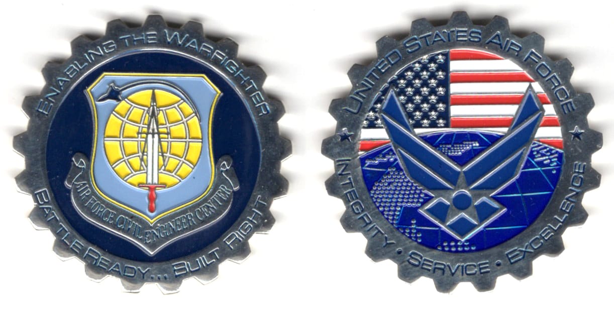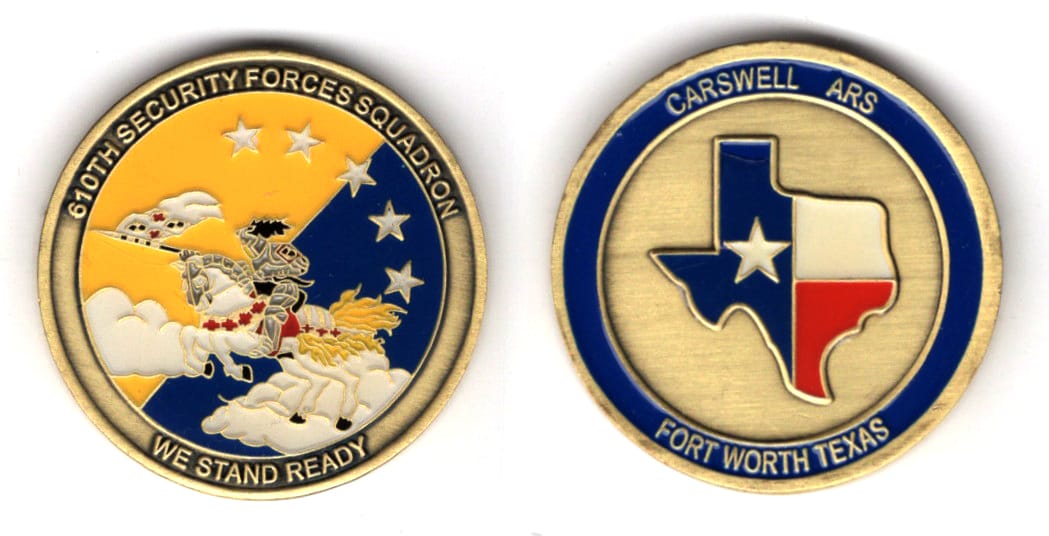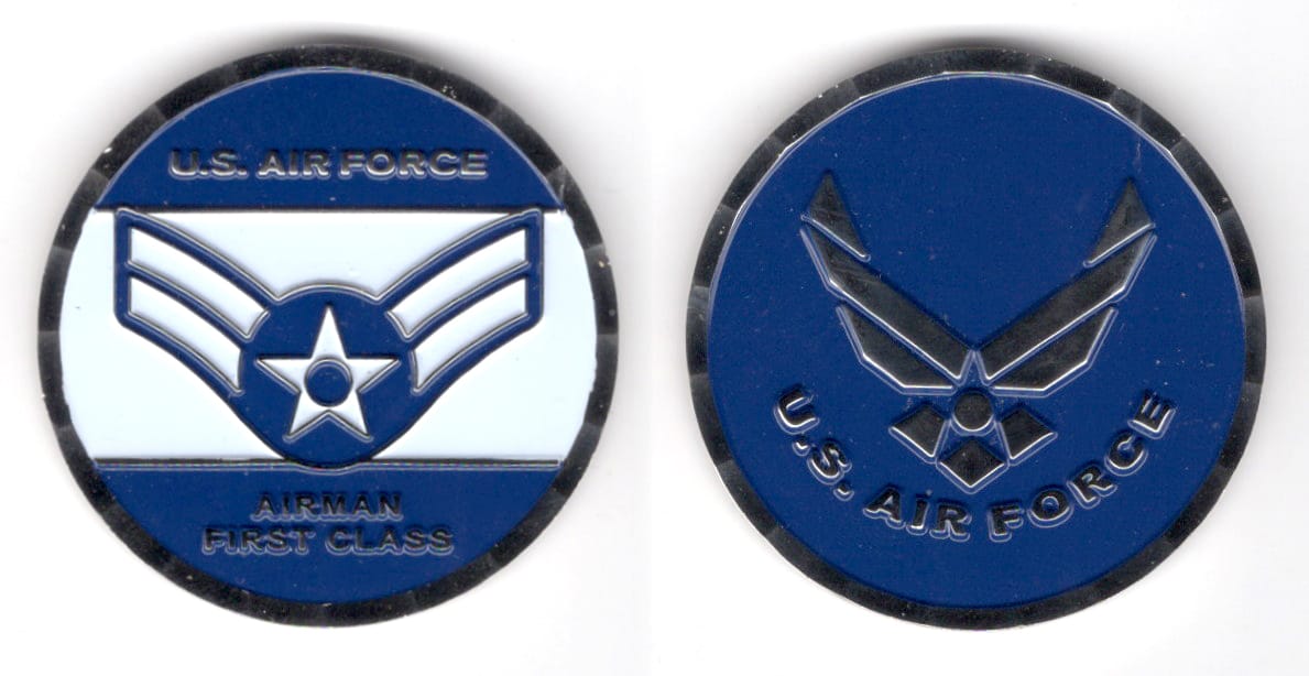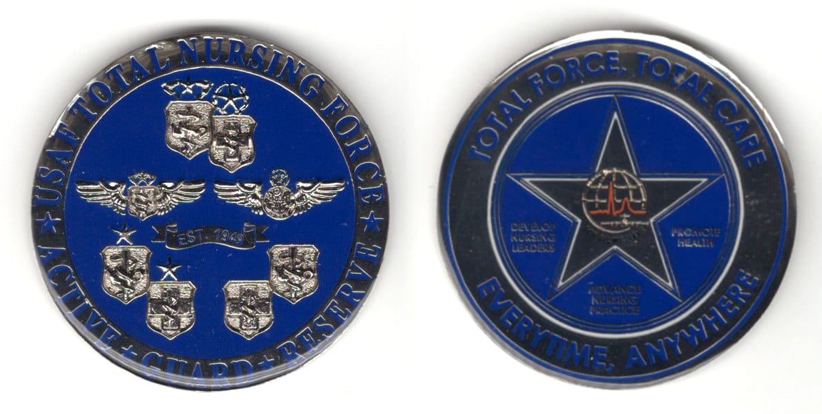 Round shaped coin, pewter in color, 1 3/4 inches in diameter. Journal - Page 114 - Line 14 The coin was donated by a member of the 59th Medical Wing, Joint Base San Antonio, Lackland, Texas. Read More