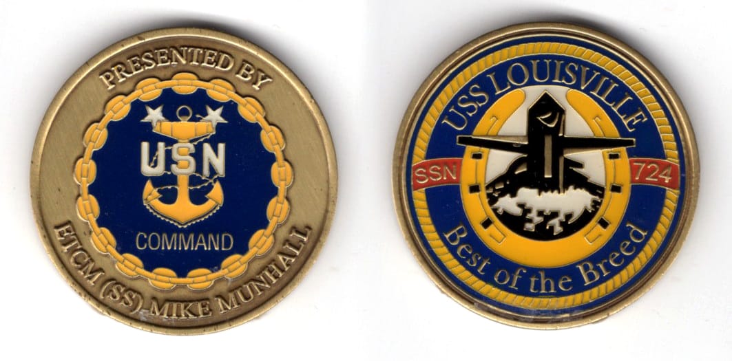 Round shaped coin, antique brass in color, 1 3/4 inches in diameter. Journal - Page 114 - Line 16 CDR Meyer was assigned to Coastal Riverine Squadron 3, Imperial Beach, California. Read More