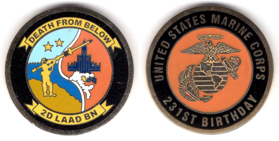 Rouns shaped coin, brass in color, 1 1/2 inches in diameter. 2nd Low Altitude Air Defense Battalion (2nd LAAD) is an air defense unit of the United States Marine Corps. They are part of Marine Air Control Group 28 (MACG-28) and the 2nd Marine Aircra... Read More