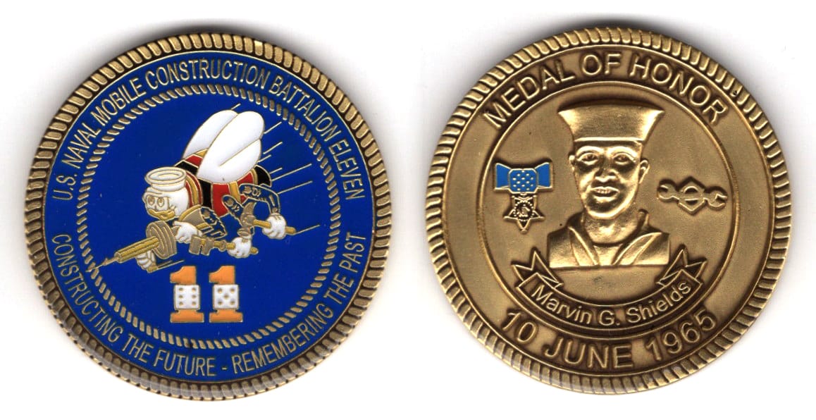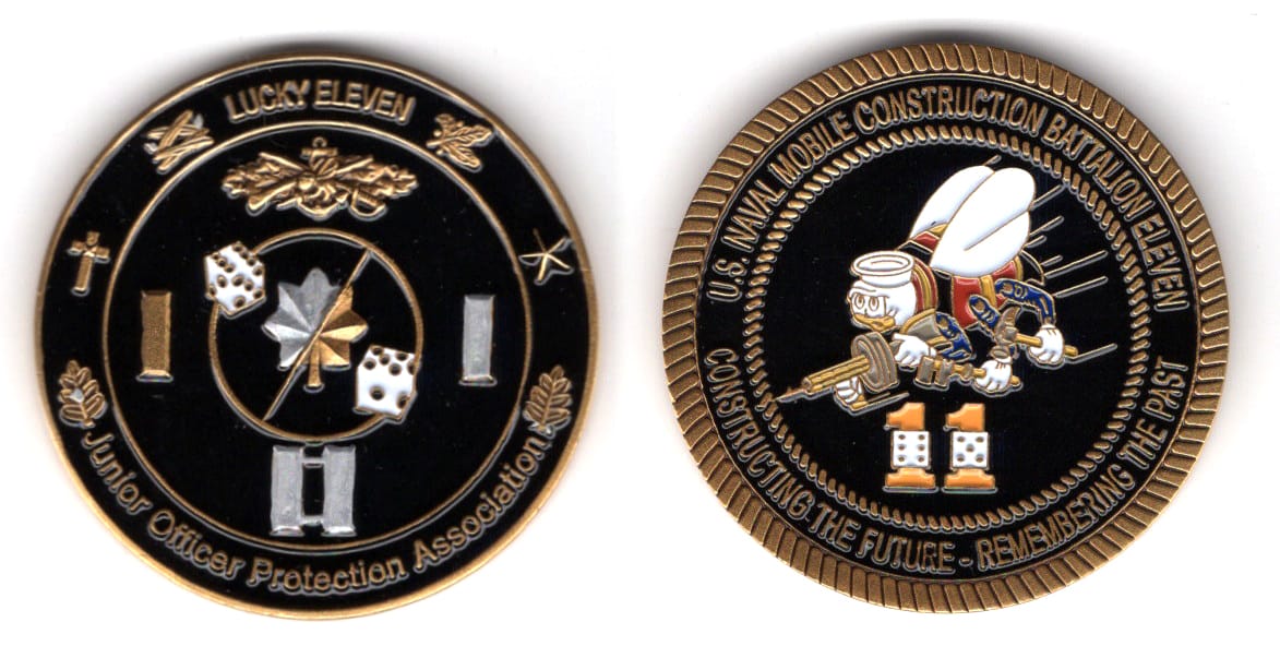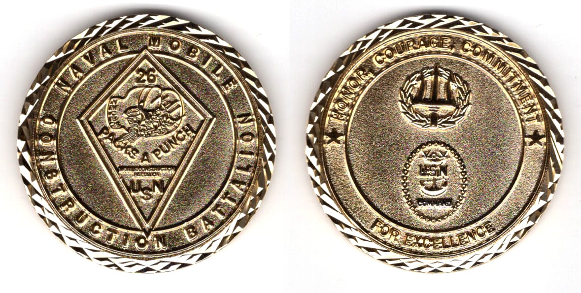 Round shaped coin, brass in color, 1 3/4 inches in diameter. Journal - Page 113 - Line 33 Naval Mobile Construction Battalion 26 (NMCB-26) Naval Mobile Construction Battalion TWO SIX... Read More
