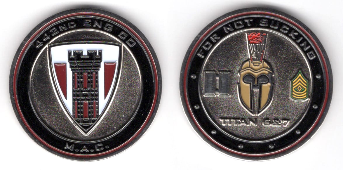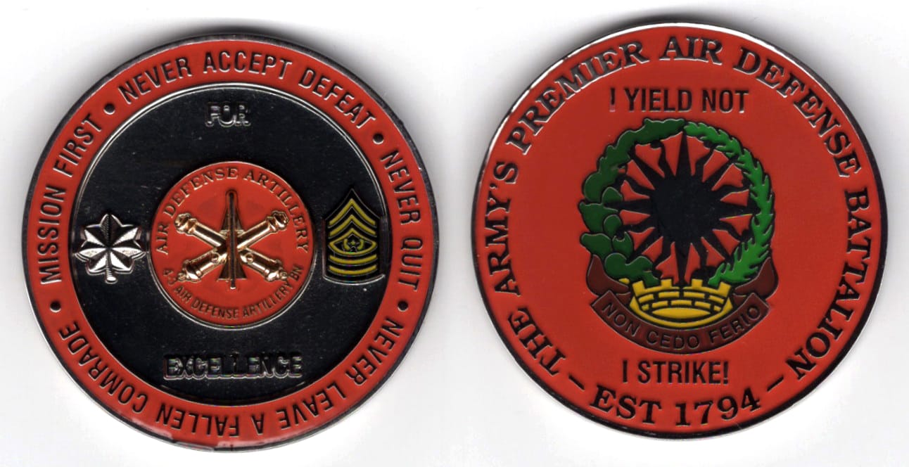 Round shaped coin, antique brass in color, 2 inches in diameter. Journal - Page 114 - Line 2 4th Battalion, 3rd Air Defense Artillery Regiment (4-3rd ADA Bn) Read More