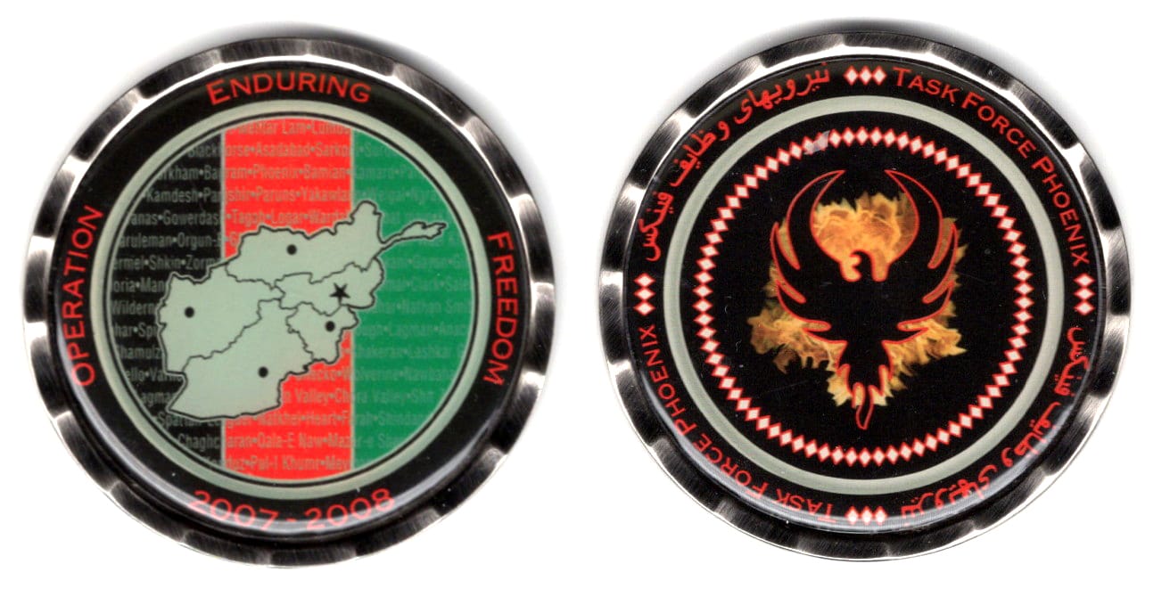 Round shaped coin, pewter in color, 2 inches in diameter. Task Force Phoenix, or more properly known as Combined Joint Task Force Phoenix (CJTF Phoenix), is an international military formation. It was organized by the United States Central Command (... Read More