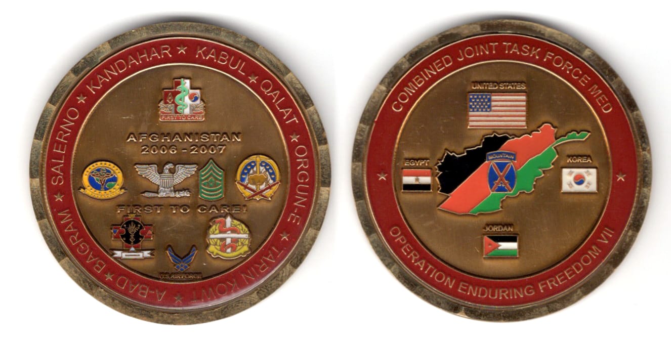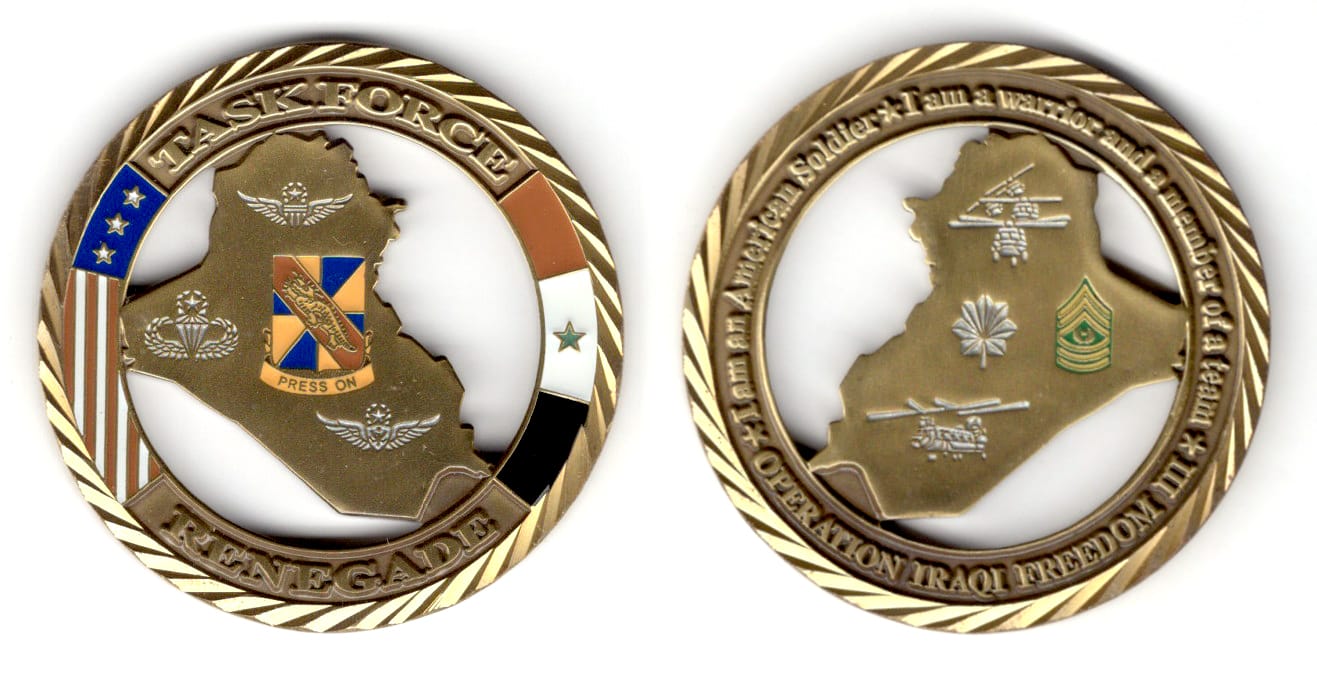 Round shaped coin, antiqu3 brass in color, 2 inches in diameter. Task Force 168 in OEF-5 was organized around the 1st Battalion, 168th Infantry Regiment, Part of the Iowa Army National Guard. Read More