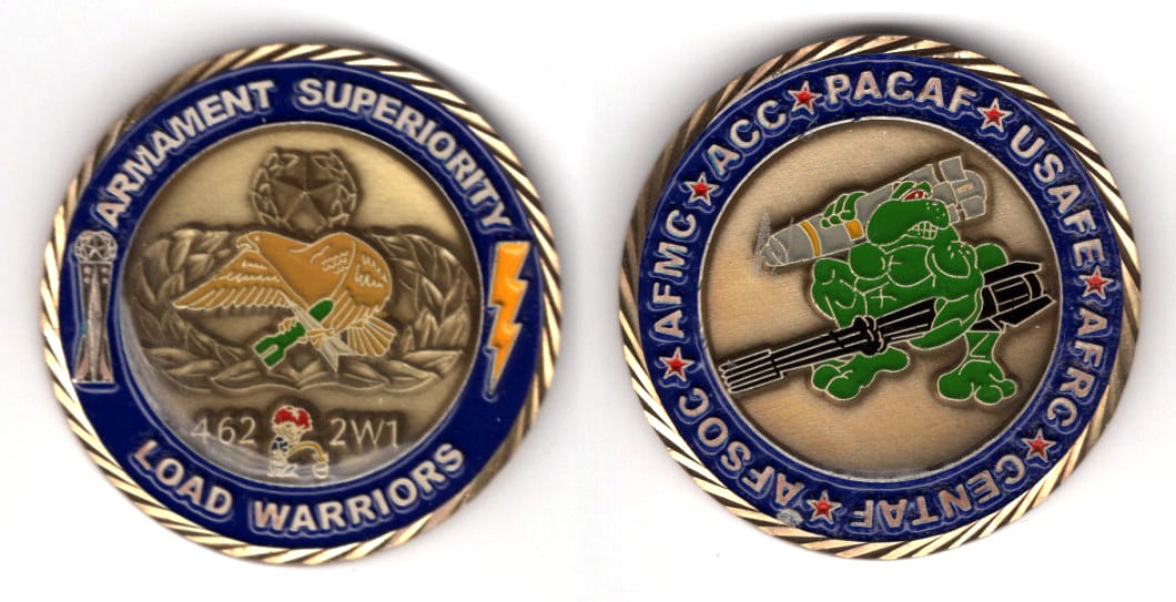 Round shaped coin, brass in color, 1 1/2 inches in diameter. USAF Load Warriors - Aircraft Armament Systems: USAF military specialty - Load and unload nuclear and non-nuclear munitions, explosives and propellant devices on aircraft; manage, control,... Read More