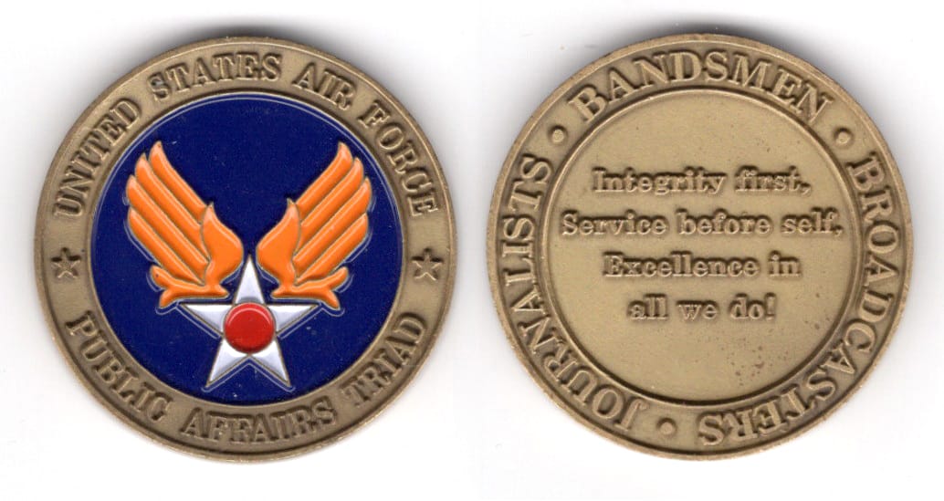 Round shaped coin antique brass in color, 1 1/2 inches in diameter. The U.S. Air Force engages in Public Affairs to provide trusted counsel to leaders; build, maintain, and strengthen Airman morale and readiness; enhance public trust and support; an... Read More