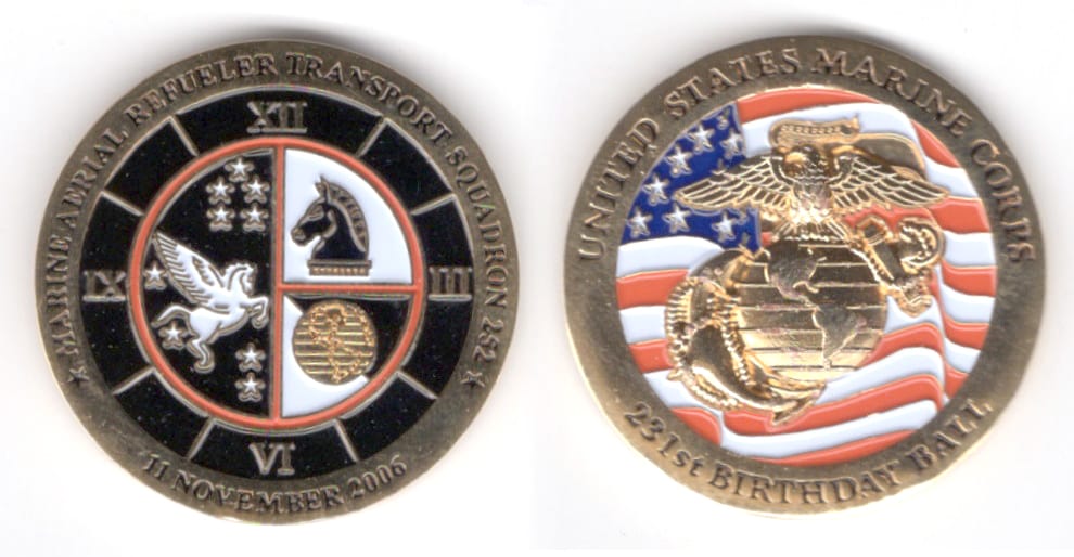 Round shaped coin, brass in color, 1 1/2 inches in diameter. Marine Aerial Refueler Transport Squadron 252 (VMGR-252) Read More