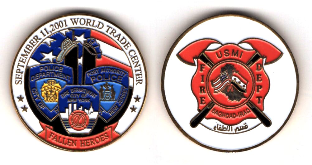 Round shaped coin, brass in color, 1 1/2 inches in diameter. A commorative coin struck by the the US Mission, Iraq (USMI) to honor the fallen heros of the World Trade Center attack on 11 September 2001 (9-11). The US Mission, Iraq is part of the US... Read More