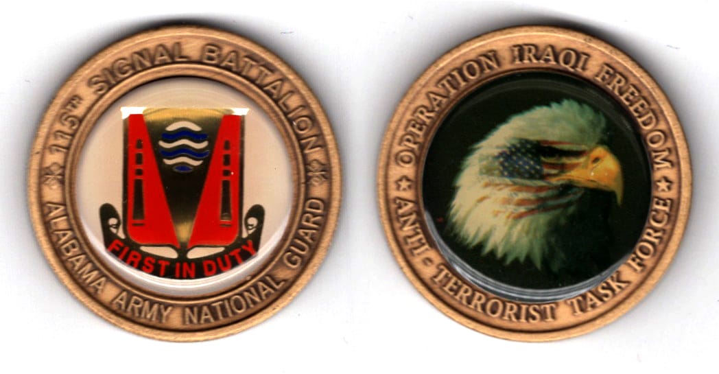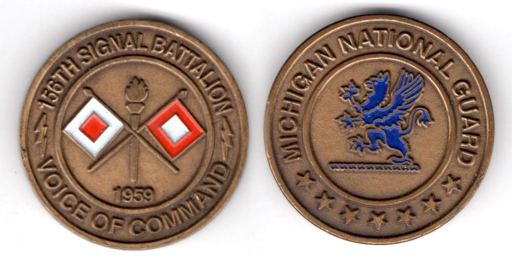 Round shaped coin, very antique brass in color, 1 1/2 inches in diameter. The 156th Brigade Signal Company, Michigan Army National Guard, based in Adrian, has the mission to provide satellite-based communication. The 35 assigned members are challen... Read More