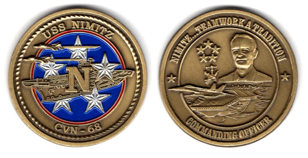 Round shaped coin, antique brass in color, 1 1/2 inches in diameter. USS Nimitz (CVN-68) is a supercarrier of the United States Navy, and the lead ship of her class. One of the largest warships in the world, she was laid down, launched and commissio... Read More