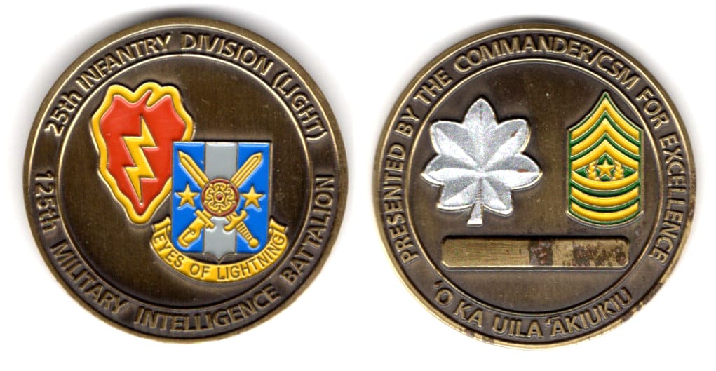 Round shaped coin, antique brass in color, 1 1/2 inches in diameter As part of the modular reorganization of the 25th Infantry Division the 125th Military Intelligence Battalion was inactivated on 15 August 2005 after serving with the Tropic Lightni... Read More