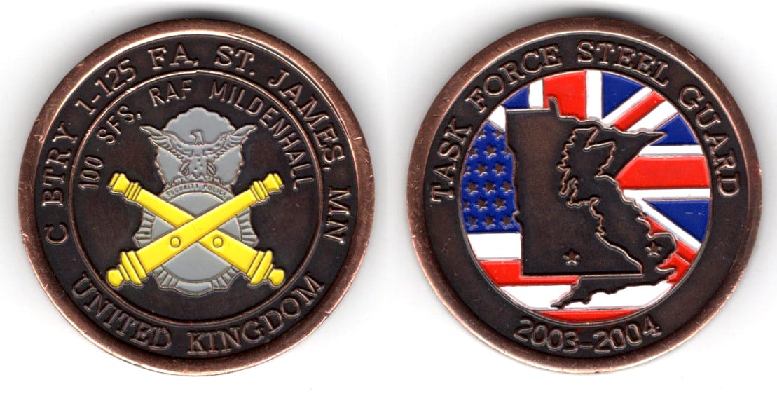 Round shaped coin, antique copper in color, 1 3/4 inches in diameter. The 1st Battalion, 125th Field Artillery, is a Minnesota Army National Guard battalion headquartered in New Ulm. The 1-125 FA provides artillery fire support to the 1st Arm... Read More