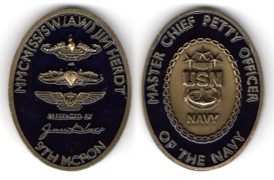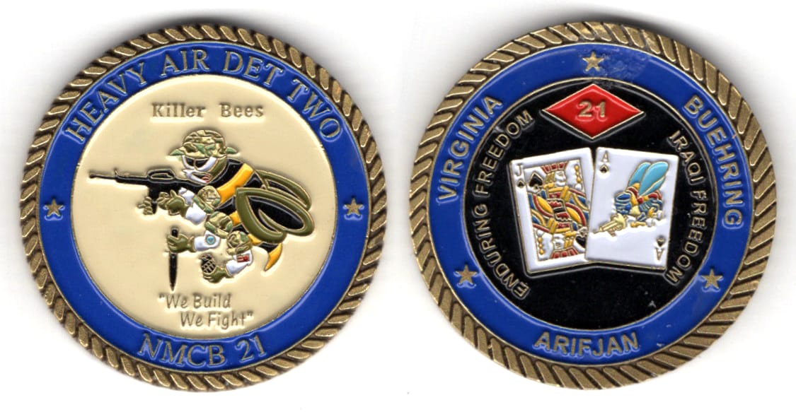 Round shaped coin, antique brass in color, 1 3/4 inches in diameter. 3/26/2013 - JOINT BASE MCGUIRE-DIX-LAKEHURST, N.J. -- Naval Mobile Construction Battalion 21 celebrated their last Seabee Ball and shared their unique history one final time March... Read More