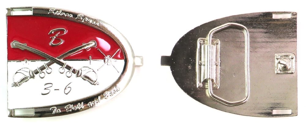 Belt buckle shaped, pewter in color, 2 3/4 inches high x 3 1/2 inches wide. Journal - Page 118 - Line 16 Read More