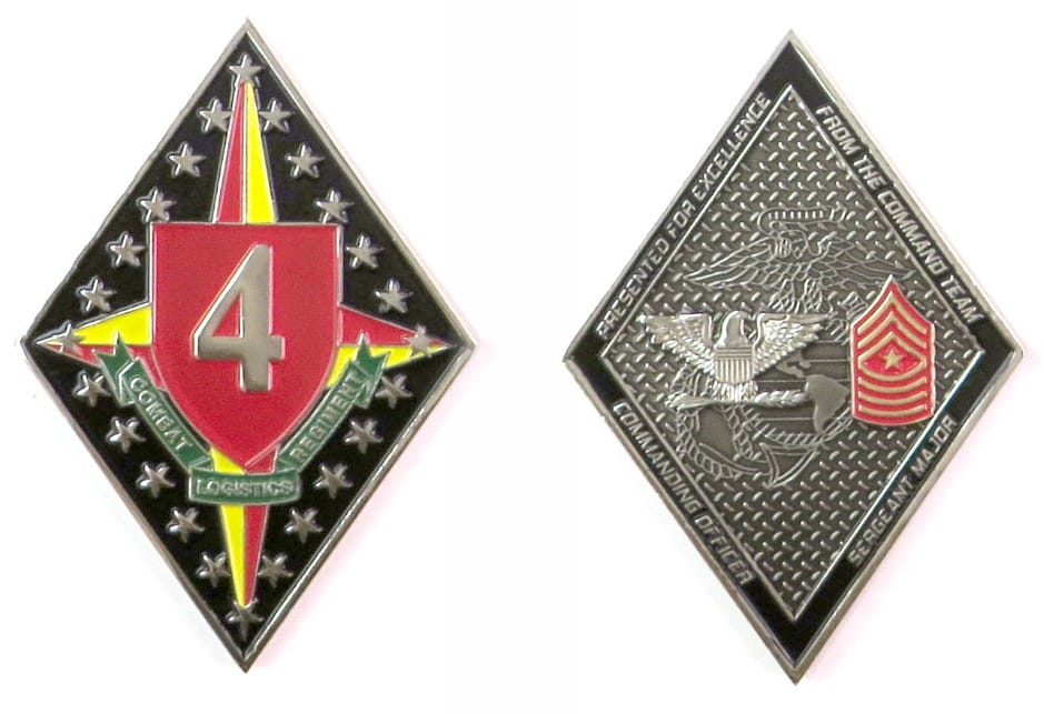 Coin is diamond shaped, pewter in color, 3 inches high x 2 inches wide. Journal - Page 118 - Line 25 4th Combat Logistics Regiment (CLR-4) was activated on 8 September 2013 in Kansas City, Missouri. CLR-4 is a Regiment of the United States Marine... Read More