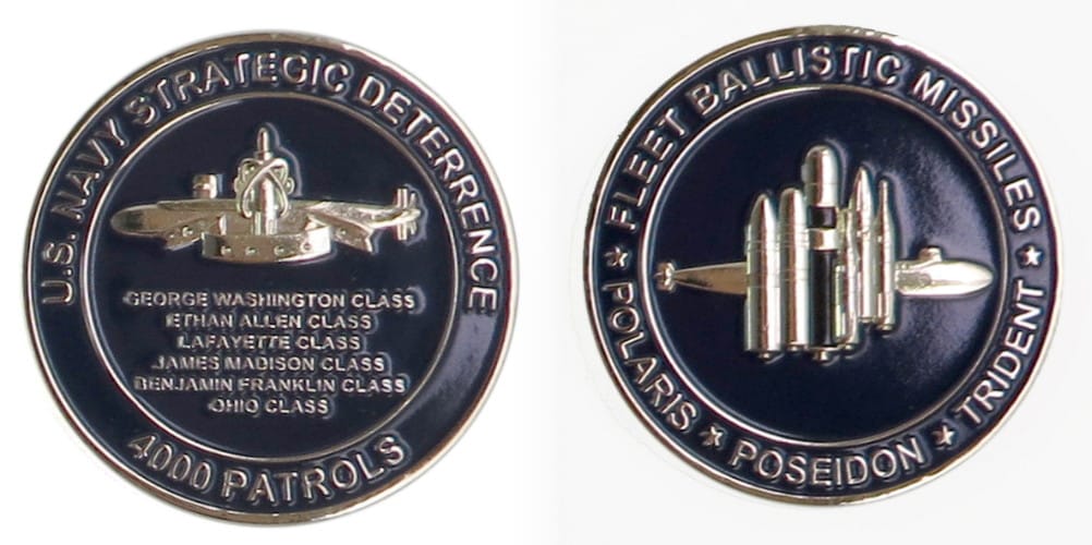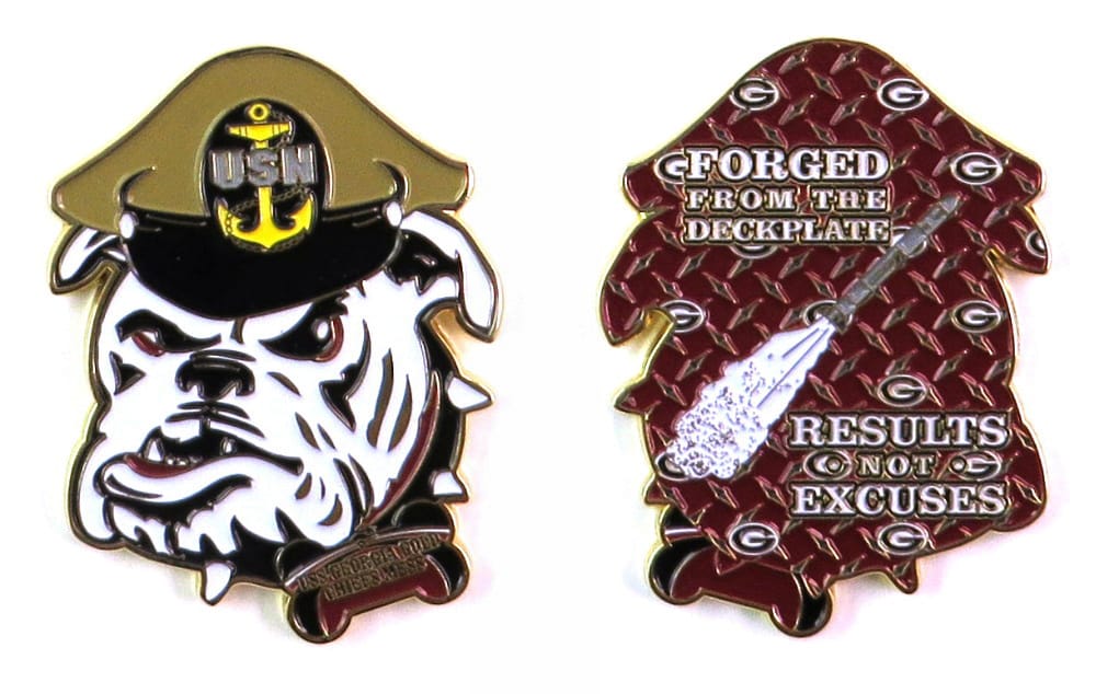 Coin is shaped like the head of a cartoon bullldog with a Navy combination cap on its head and a spiked collar with a bone- shaped dog tag; brass in collar; 2 1/2 inches high x 2 inches wide. Journal - Page 118 - Line 35 USS Georgia (SSBN-729/SSG... Read More