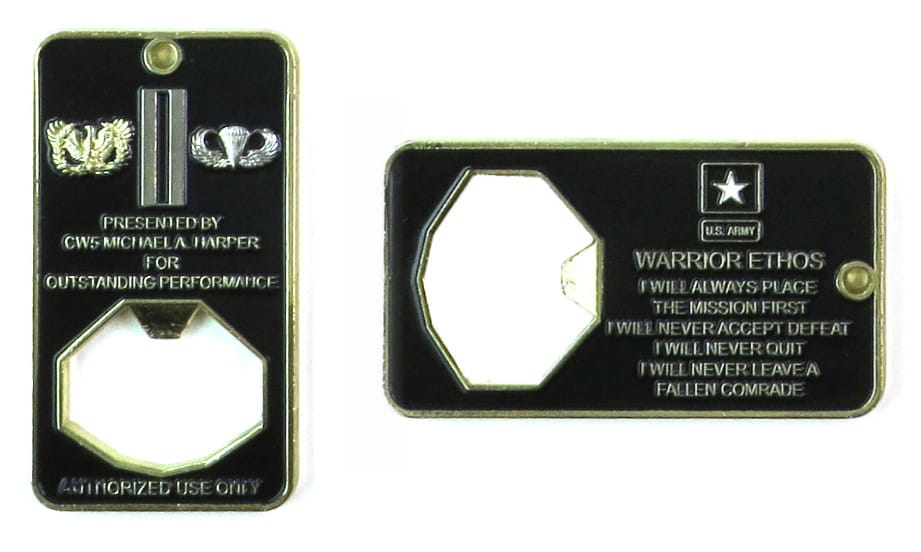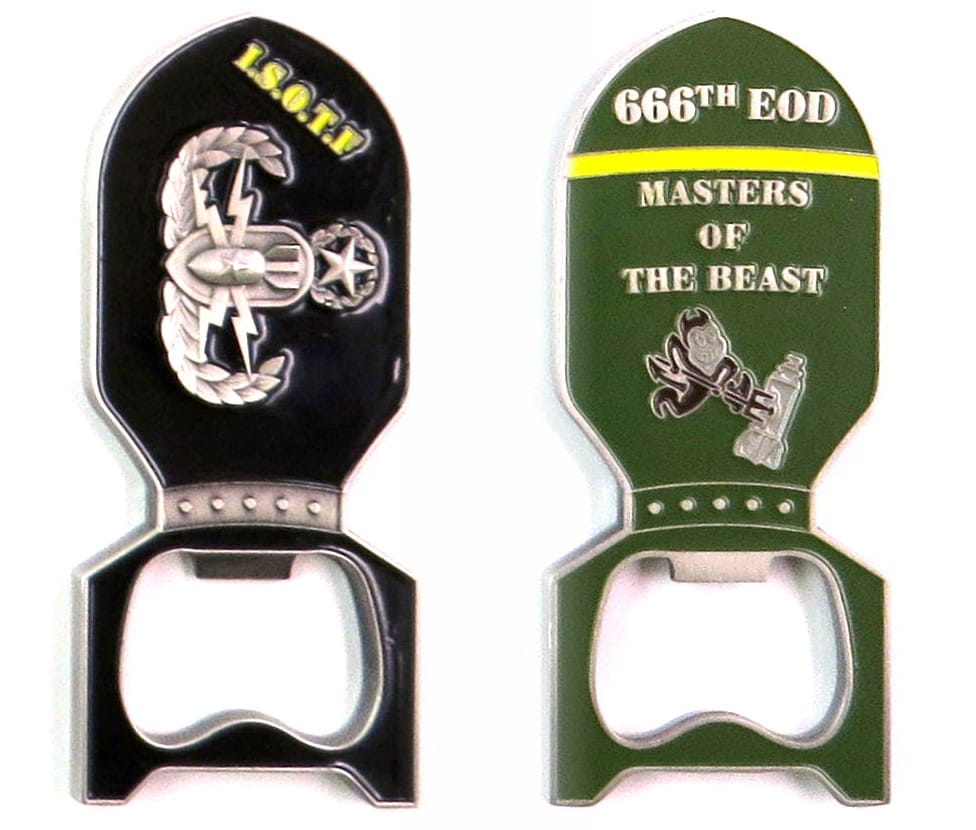 Coin is shaped like a cartoon missile shape with a bottle opener opening in its tail, pewter in color, 3 inches high x 1 1/4 inches wide. Journal - Page 117 - Line 26 The 666th Ordnance Company EOD from the Alabama National Guard was deployed to... Read More