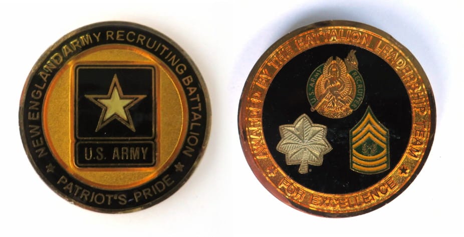 Round shaped coin, brass in color, 2 inches in diameter. Journal - Page 117 - Line 4 PVT Enlisted into theArmy in on 2 June 2015 and the coin was given to him by 1SG Roger Felix who was instrumental in his enlistment. PVT Young is now serving in... Read More