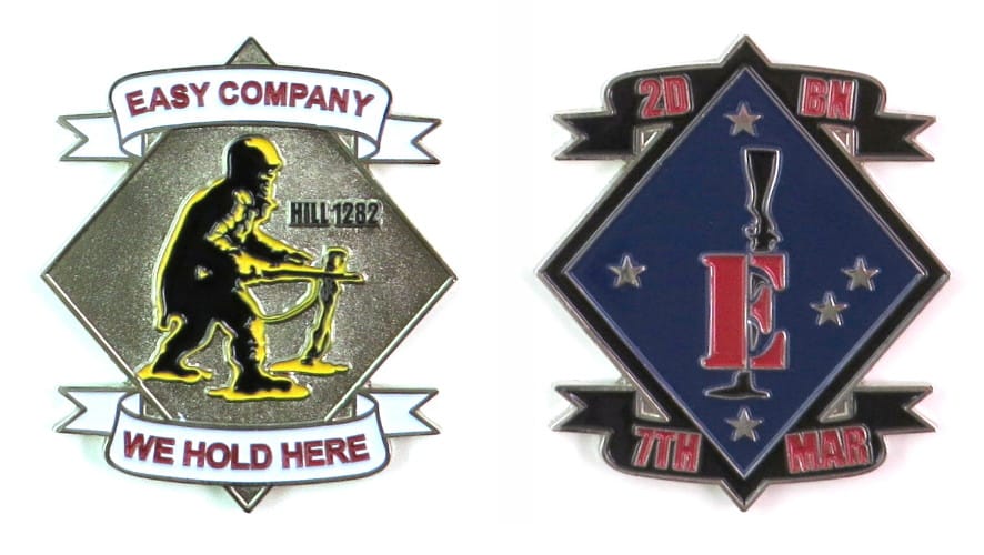 Coin is diamond shaped with the long axis vertical and ribbon banners draped over the top and bottom points, pewter in color, 2 1/2 inches high x 2 1/8 inches wide. Journal - Pge 118 - Line 12 The 2nd Battalion, 7th Marines (2/7) is a ligh... Read More