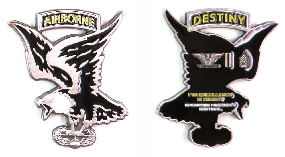 Coin is shaped like a menacing bald eagle perched on an air assault badge and with an airborne tab above its outstretched wings, pewter in color, 2 1/2 inches high x 2 inches wide. Journal - Page 117 - Line 5 On 1 January 2015, U.S. Forces-Afghan... Read More