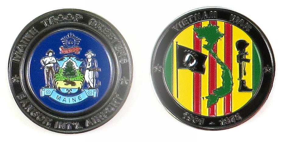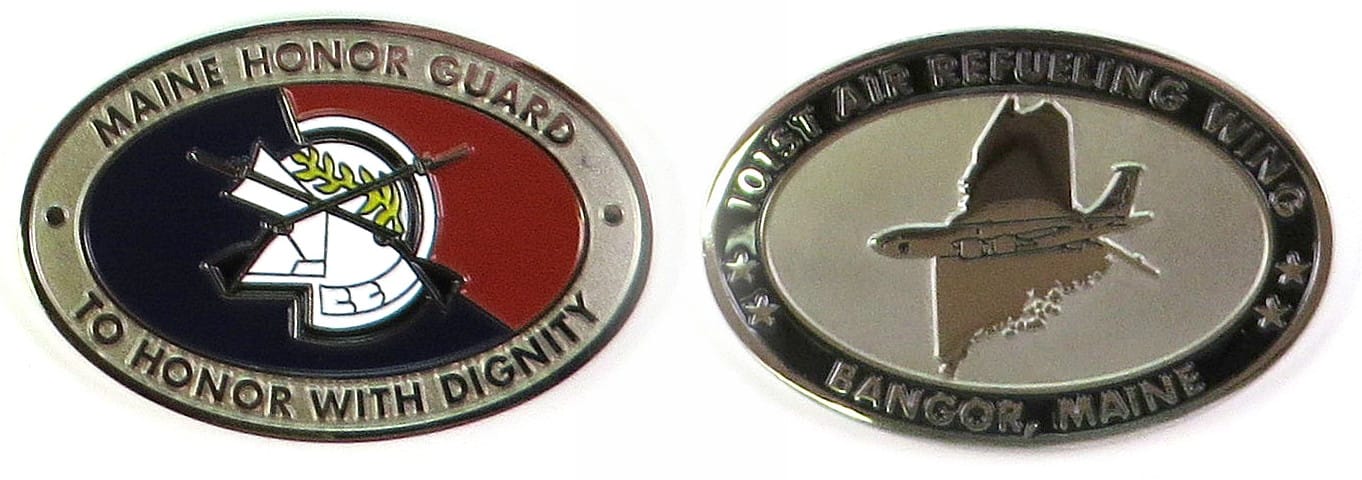 Oval shaped coin, pewter in color, 1 1/2 inches high x 2 1/4 inches wide. Journal - Page 117 - Line 21 The 101st Air Refueling Wing (101 ARW), affectionately known as the "Mainacs" is a unit of the Maine Air National Guard, stationed at Bangor Ai... Read More