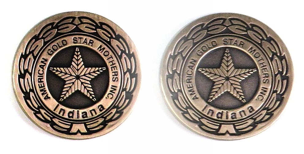 Round shaped coin, brass in color. 1 1/2 inches in diameter. Journal - Page 118 - Line 5 Gold Star Mothers Indiana is a chartered chapter of the American Gold Star Mothers, Inc. organization. American Gold Star Mothers, Inc. (AGSM), is a private... Read More