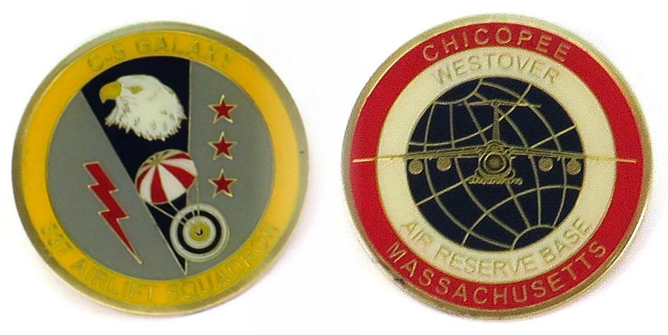 Round shaped coin, brass in color. 1 1/2 inches in diameter. Journal - Page 116 - Line 14 The 337th Airlift Squadron flies the C5 Galaxy. Read More
