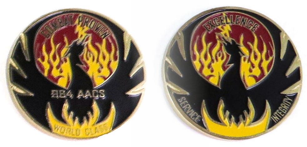 Round shaped coin, brass in color, 1 1/2 inches in diameter. Journal - page 117 - Line 35 The 964th Airborne Air Control Squadron ((64th AACS) operates the E-3 Sentry (AWACS) aircraft and conducts airborne command and control missions. Read More